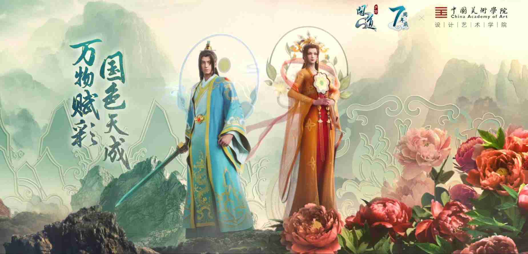 2023年4月,,,《问道手游》联动中国美术学院,,,在游戏中融合了中国历史上不同时期的文化元素,,,打造了“山河万象”与“凤鸣九霄”的国风时装。。。。在色彩配置方面,,,创作团队基于对游戏角色特性的分析提取相应的文化内涵,,,,从每一种色彩的色相、、指代事物和情感出发对应角色属性,,,选定服装的色彩搭配。。。在纹样设计方面,,,,创作团队结合游戏角色自身特殊的造型比例和形态,,,在实际的纹样设计中进行了游戏语境下的活化演绎。。。男性角色集中使用了如蟒纹、、海水江崖纹、、如意纹和云气纹等传统纹样元素,,,,女性角色则吸纳了凤凰纹、、牡丹纹、、、、卷草缠枝纹等元素,,,,组成以“双凤牡丹纹样”“缠枝牡丹纹”“金玉凤冠头饰”为主要纹样的游戏角色装饰图案系统。。。。
