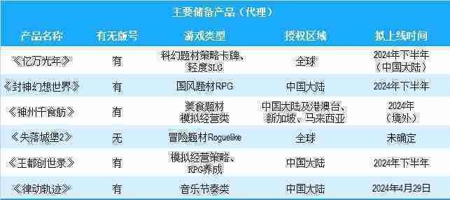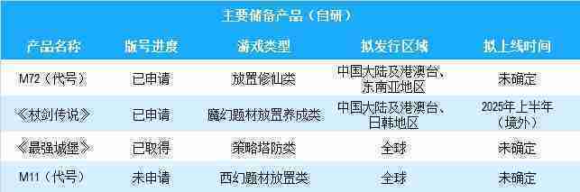 公司有多款储备产品,,涵盖放置类、、、、策略类、、、、RPG、、、、Roguelike等多元化游戏品类,,储备的主要自研和代理产品如下::::