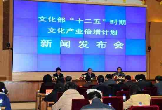 2月28日下午,,,,文化部在京召开新闻发布会,,,,正式向社会发布《文化部“十二五”时期文化产业倍增计划》,,,提出了 “十二五”期间文化部门管理的文化产业增加值年平均现价增长速度高于20%,,,,2015年比2010年至少翻一番,,,,实现倍增的奋斗目标。。。。